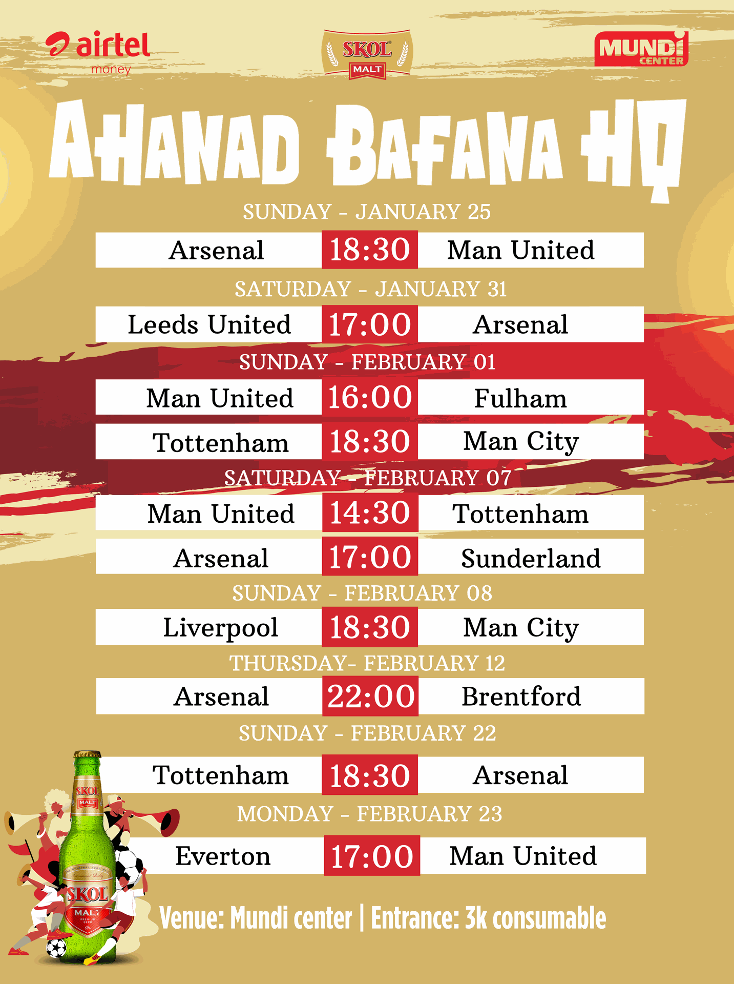 The true home of football. Big games, bigger screens, cold drinks, good food, and nonstop chants from kickoff to final whistle. Catch every Premier League clash right here at Mundi Center, where football lives.