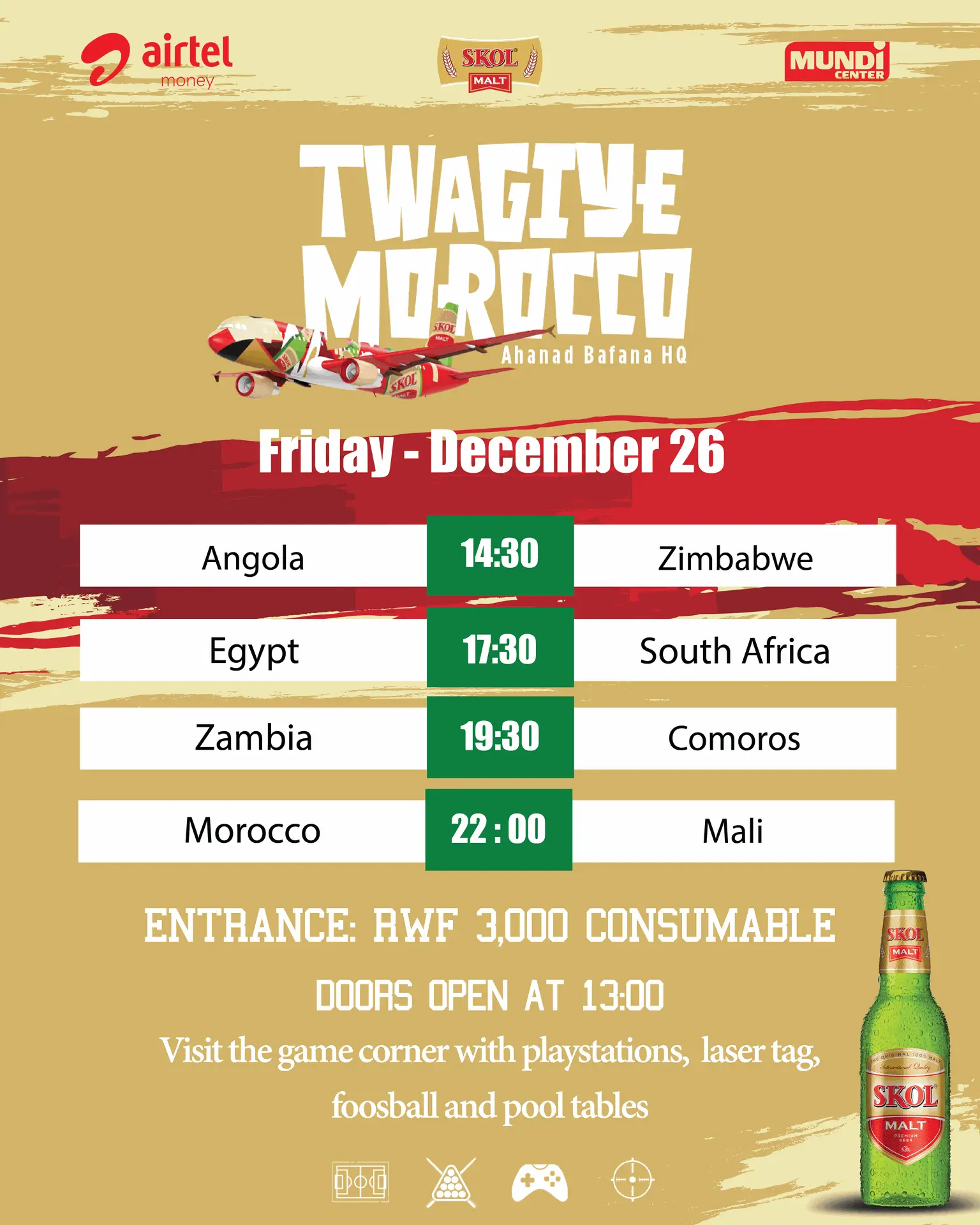 Come through with the crew, enjoy the vibes, great food, and an ice-cold Skol Malt as Africa lights up the big screen 🍻