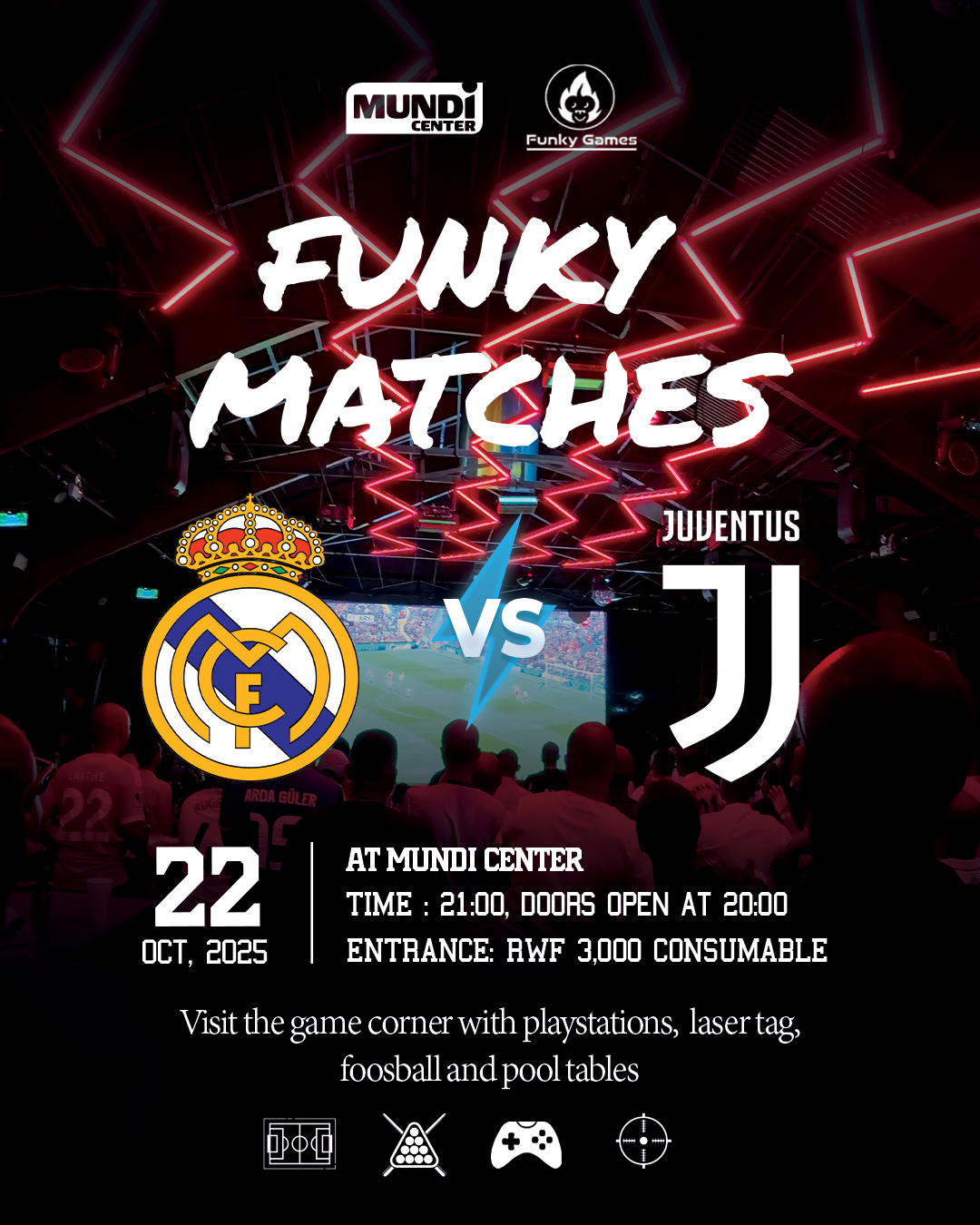- 🎮 During the half-time pause, step around the corner to Funky Monkey Games: pool tables 🎱, PlayStation setups 🕹️, foosball ⚽, and more—keep the competition going while you refuel!